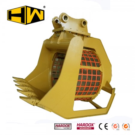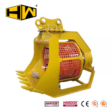 產品特點:18-25噸級挖掘機用旋轉篩分網斗,適合篩分顆粒較小物料。篩網孔規(guī)格可根據物料大小多種選擇(可配20*20-80*80mm),更換方便,大大減少機器損耗和操作難度。 適用范圍:適用分離較松軟的物料,挖掘與分離一次完成。專設于篩分沙石,效率比普通篩網斗高。